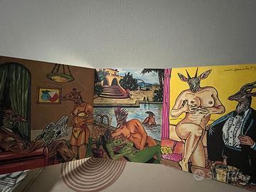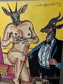 “MAX HAMLET SAUVAGE Sculture Dipinti Disegni” Museo Surrealista Arte Erotica 1994 Schwarz A., Di Genova G., Restany P., Sala A. Importante prima edizione illustrata con 387 tavole a colori, molte a piena pagina, e varie decine di foto a colori e in nero nel testo. Pagine leggermente ingiallite, ma intatte, senza segni. Sovraccoperta in buone condizioni con lieve strappo sul retro. Esemplare completo della litografia originale numerata e firmata dall'artista, n.208/250: trittico "EROS PARTY", cm 31x70,5 allegata al volume.