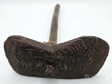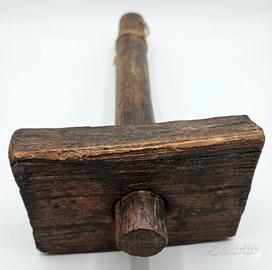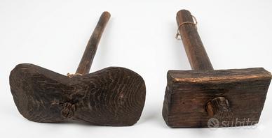mazzuuoli o martelli da battitura in legno. In ambito contadino e artigianale, questi strumenti venivano utilizzati per lavori che richiedevano forza ma non dovevano danneggiare la superficie colpita (come incastrare giunti di mobili, battere su scalpelli con manico in legno o lavorare fibre tessili). Morfologia: Il primo (a sinistra): Ha una testa sagomata a "becco" o a cuneo, che ricorda quasi una piccola piccozza. Poteva essere usato per lavori di precisione o per calafatare (nel settore nautico/botti). Il secondo (a destra): È un classico mazzuolo a testa rettangolare, tipico della tradizione dei falegnami o dei bottai. Materiale: Legno massello, probabilmente rovere, frassino o olmo per via della resistenza alle sollecitazioni. Il colore scuro suggerisce un'età avanzata e una possibile esposizione a fumi di camino o trattamenti protettivi d'epoca (olio di lino o mallo di noce). Periodo: Sono manufatti risalenti all'incirca alla fine dell'Ottocento o ai primi del Novecento. prezzo trattabile