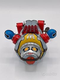 Robot giocattolo vintage in latta chiamato "Mechanical Sparking W Robot", prodotto dall'azienda giapponese Noguchi (o "N") negli anni '50 o '60. con scritta Made in Japan. Funziona a carica (con chiave) e presenta un'azione di camminata meccanica che genera scintille visibili all'interno della cavità toracica.- Estremamente Raro.