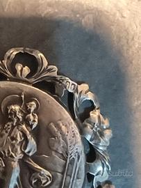 bellissima medaglia in argento 800 antica. raffigurante San Cristoforo, protettore dei viaggiatori e degli automobilisti . la medaglia è circondata da una cornice decorativa lavorata a motivo floreale.