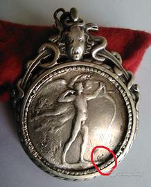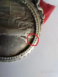 Riconoscimento militare per tiro a segno durante la prima guerra mondiale. Ritengo sia un pezzo molto raro o addirittura unico! Sicuramente lavorato a mano, in basso a destra si nota incisa la sigla dello scultore orafo. Sulla banda all'incrocio dei fucili si intravvede il motto "PRO PATRIA ET REGE". Parzialmente usurata in quanto per anni usata come contrappeso agganciato tramite catenina d'argento ad un orologio da tasca e quindi entrava ed usciva dal taschino del gilet. Ha un buon peso e misura all'interno circa mm 26 di diametro mentre all'esterno tutta la lavorazione manuale della cornice misura circa mm 30 x 44. Valuto offerte da collezionisti interessati. Contattare per ulteriori informazioni o dettagli.