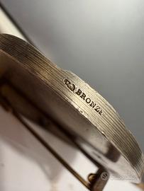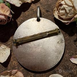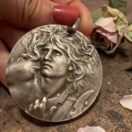 C’è uno sguardo che non si limita a guardare. Sembra ascoltare qualcosa che noi non sentiamo più. Il volto è quello di Orfeo, il musicista capace — secondo il mito — di incantare ogni cosa: uomini, animali, persino ciò che si trova oltre la vita. Qui è colto in un momento sospeso, con la lira appena accennata, come se la musica fosse appena passata… o stesse per tornare. Questa medaglia, firmata da Lucien Coudray e disegnata in Francia tra fine Ottocento e inizio Novecento, appartiene pienamente al linguaggio Art Nouveau: linee morbide, natura che si intreccia al corpo, espressione intensa ma mai teatrale. Vinse il Prix de Rome questo pezzo. Può essere indossata come pendente oppure come spilla, adattandosi a chi la sceglie senza perdere nulla della sua identità. È un pezzo di dimensioni generose e a dir poco “parlante”, di una bellezza narrativa che non abbisogna di parole. Il bordo riporta la dicitura “bronze”, che identifica il modello originario, ma questo esemplare è placcato in argento (verificato). È uno di quegli oggetti che non si spiegano del tutto. Si avvicinano… e qualcosa succede. Ci “accadono” addosso e dicono molto, agli altri, del nostro amore per la cultura. •Provenienza: Francia •Autore: Coudray •Materiale: bronzo placcato argento •Diametro: 4,2 cm •Peso: 30 g •Condizioni: buone, coerenti con l’età •Utilizzo: pendente + spilla