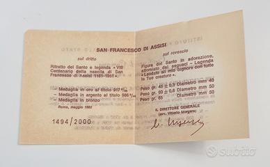 edaglia in bronzo dedicata a San Francesco d'Assisi, in occasione dell'VIII centenario della sua nascita. In box ufficiale e certificato GR. 55 diametro 50 mm.