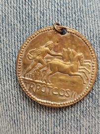Medaglia commemorativa del generale Agrippa. Sull'altra faccia della medaglia è rappresentato il dio del sole in quadriglia. Foro originale per sospensione. Materiale bronzo dorato. Diametro circa 31,5 mm ,peso circa 10 gr.