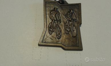 medaglia in bronzo scuro con forma particolare su cui è inciso in rilievo soggetto sportivo di ciclismo o altro sport su pista. per collezionismo.