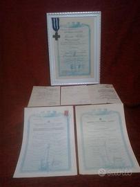 MEDAGLIA CROCE AL MERITO DI GUERRA in teca di vetro, completa di documentazione e diplomi in forma cartacea e in buone condizioni.