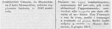 Decorazione al valore militare conferita al Fante VITTORIO DARDANO per atti di eroismo sul Monte Belmonte il 3 giugno 1916