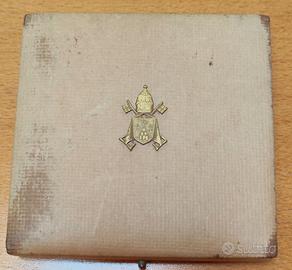 Questa è una medaglia commemorativa privata, coniata in occasione del Concilio Ecumenico Vaticano II, che si è tenuto a Roma, nella Basiliva di San Pietro in Vaticano, dall’11 ottobre 1962 all’8 dicembre 1965. Il dritto della medaglia raffigura San Pietro, il retro reca l’arma di Paolo VI presente anche sul fronte della scatola a custodia della medaglia.