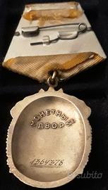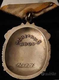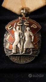 Bel esemplare della medaglia per l'Ordine del Distintivo d'onore dell'ex Unione Sovietica, istituito il 25 novembre 1935 con decreto della commissione esecutiva centrale dell'URSS, è di forma ovale ed è in argento e smalti rossi con peso totale di 34 grammi. Su di esso sono raffigurati due lavoratori in marcia trionfale che portano ognuno una bandiera rossa con la scritta in cirillico PROLETARI DI TUTTO IL MONDO, UNITEVI .al rovescio, nella parte incava, vi è il numero di assegnazione 1364378, che lo fa datare alla fine degli anni '80. L'ordine è alto 46mm e largo 32,5mm, con il classico nastrino di stile sovietico di forma pentagonale di colore giallo e giallo ocra., ed è in perfette condizioni. Spedizione: Raccomandata (7 euro); Metodi di Pagamento: Bonifico Bancario. Vaglia Postale, Paypal verso amici, altri sistemi postali-