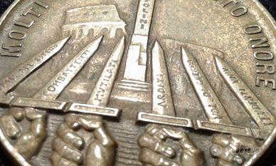 Medaglia commemorativa della 6° Divisione CC.NN. "Tevere", realizzata in bronzo su disegno dello scultore De Marchis che l'ha firmata sul dritto e che raffigura il genio fluviale del Tevere sdraiato che si appoggia ad un'anfora che versa acqua sulla carta geografica dell'Etiopia impugnando nella mano sinistra un Fascio Littorio. Sul retro un obelisco centrale con inciso il nome "Mussolini" e sullo sfondo il colosseo. In basso sei pugnali levati con sulla lama inciso il nome delle unità combattenti del Fascismo. In alto il motto della divisione "Molti nemici, molto onore". La 6a Divisione Camicie Nere "Tevere", il cui motto è "Molti nemici, molto onore", composta di italiani residenti, mutilati, combattenti, volontari di guerra, arditi e studenti universitari, viene costituita il 7 agosto 1935.