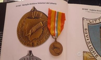 Splendida ed assai ricercata medaglia della DIVISIONE VOLONTARI DEL LITTORIO attiva in Spagna a seguito del CTV (OMS). Dal 1° al 26 luglio 1938, il C.T.V. ( Corpo Truppe Volontarie ) in Spagna venne impiegato nelle operazioni cosiddette di "Levante" con la seconda battaglia dell'Ebro. Si crearono così le premesse per la battaglia di Catalogna. Dal 19 al 22 settembre le truppe del C.T.V. ebbero modo di distinguersi nelle azioni della Sierra del Javalambre. Nel frattempo gli avvenimenti politici e militari, realativi all'appoggio internazionale dato ad entrambi i contendenti, ebbero ulteriori sviluppi. Per quanto riguarda il C.T.V. il Generalissimo Franco emanò, in data 1° ottobre 1938, un decreto con effetto immediato con il quale ordinava il licenziamento dei Legionari italiani con più di 18 mesi di campagna. Analogamente i repubblicani avevano provveduto alla smobilitazione delle Brigate Internazionali. Il 5 ottobre le divisioni "Volontari del Littorio" e "Fiamme Nere-XXIII Marzo" vennero considerate non più facenti parte del C.T.V. Al dritto DIVISIONE VOLONTARI DEL LITTORIO