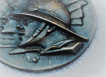Interessante e rara medaglia d'epoca fascista di propaganda e per i reduci dalle “Campagne dell’Africa Orientale” cosiddetta di tipo “A”. La decorazione in argomento è stata coniata nel 1936 da “F.M. LORIOLI & CASTELLI - MILANO” incisore “GOFFREDO VERGINELLI” ed è stata realizzata in bronzo argentato. Della stessa ne esistono anche coni in bronzo e bronzo dorato. Sul dritto sono raffigurate, di profilo volte a sinistra, due teste accollate e sovrapposte della “Dea della Vittoria” e di una Camicia Nera con casco coloniale e sullo sfondo un fascio littorio posto in obliquo con stella in alto e mare in basso. Sul verso sono invece raffigurati in alto attrezzi da lavoro (badile e martello), in basso una baionetta, un gladio e un’aquila su labaro con targa “ROMA”, al centro, la dicitura “III OTTOBRE A. XIII / V-IX MAGGIO A. XIV” (ovvero le date della Campagna d’Africa Orientale). Il cimelio risulta catalogato in collezione alla pag. 717 del testo "LE MEDAGLIE ITALIANE NEGLI ULTIMI 200 ANNI" a firma di Alessandro Brambilla. La stessa si presenta in "ECCELLENTI" condizioni di conservazione, ancora in rigorosa patina d’epoca, senza né rotture, né mancanze e/o difetti alcuno. Fornita con perizia numismatica “da tasca” nonché certificato di autenticità e provenienza a firma dello studio MORUZZI di Roma. Misure: diametro = 32,18 mm; peso = 17 grammi. Spese di spedizione = 7,00 euro con posta raccomandata, sicura, tracciata e con imballo professionale.