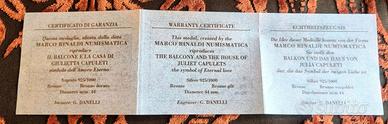 Medaglia in bronzo dorato creata da Marco Rinaldi Numismatica, Incisore G. Danelli. L’ esemplare porta al diritto il prospetto di Casa Capuleti con il famoso balcone e la legenda “CASA DI GIULIETTA” tra due nodi d’ amore. Sul rovescio anepigrafe è riprodotta la statua bronzea di Giulietta, donata nel 1972 al Comune di Verona dal Lyons Club cittadino ed opera dello scultore veronese Nereo Costantini.