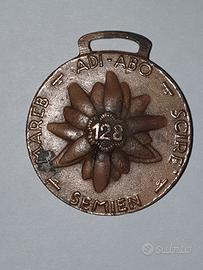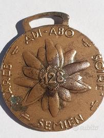 Medaglia “128ª Legione CC.NN. Alpine” – originale pezzo storico legato alla legione camicie nere alpine del periodo fascista. Realizzata in metallo con dettagli ben conservati e marcature d’epoca, mostra segni di usura e patina naturale coerenti con l’età, confermandone l’autenticità. Oggetto di grande interesse per collezionisti di militaria e memorabilia storica, ideale per esposizioni o collezioni tematiche sulla storia del Regio Esercito e delle CC.NN