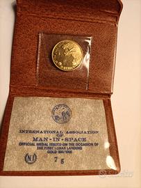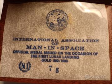 Medaglia coniata in celebrazione del primo sbarco dell'uomo sulla luna 16-24 luglio 1969. Da un lato sono raffigurati gli astronauti Edwin E. Aldrin Jr., Neil A. Amstrong e Michael Collins, dall'altro la prima passeggiata sul suolo lunare. Fondo specchio in oro titolo 900/1000 (punzonato 900), peso 7 g con confezione certificato e garanzia originali