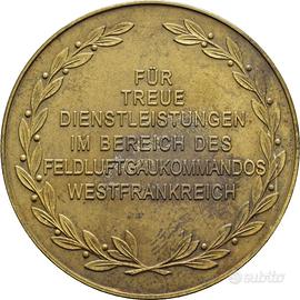 Germania – Terzo Reich – Francia - Luftwaffe. D/ ALLES FOR DEUTSCHLAND aquila in volo verso d. che tiene una croce uncinata nelle zampe su cartina della Francia. R/ FÜR TREUE DIENSTLEISTUNGEN IM BEREICH DES FELDLUFTGAUKOMMANDOS WESTFRANKREICH su più righe in corona di lauro. Realizzata in Bronzo (AE) (ᴓ 40,9 mm, 32,3gr.). In scatola d'epoca. qFDC. Medaglia per il leale servizio del Comando Aereo di Campo della Francia Occidentale". Assolutamente Originale. Pagamenti extra TuttoSubito: Bonifico Bancario, Paypal verso amici, altri sistemi postali, spedizione con pacco delivery web (8 euro). Vendita ai soli fini collezionisti e storici. Accluso alla moneta vi è il cartellino di catalogazione redatto da nota casa d'aste italiana.