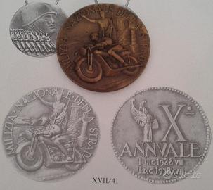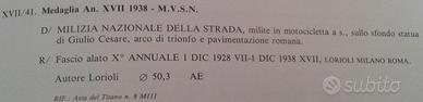 Splendido e raro medaglione in bronzo del ventennio fascista, si tratta di un grande medaglione emesso per l'anniversario del decennale della costituzione della MILIZIA DELLA STRADA avvenuta il 1 dicembre 1928, in ottimo stato conservativo e con patina del tempo bellissima, pezzo raro da trovare. Al dritto MILIZIA NAZIONALE DELLA STRADA, milite in motocicletta a s., sullo sfondo a d. statua di Giulio Cesare, arco romano e strada romana con semifusto di colonna. Al rovescio ANNVALE I DIC 1928 VII I DIC 1938 XVII, fascio alato verso d. e X grande- Peso 60 gr. Diametro 50mm. Opus Lorioli. Rife Casolari XVII-41. LaMilizia nazionale della stradaera una specialità dellaMilizia Volontaria per la Sicurezza Nazionaledestinato alla sorveglianza della circolazione stradale, attivo dal1928al1945, in seguito trasformato nellaPolizia stradale. Aveva per mottoTege et rege(Proteggi e dirigi) e il compito di curare la disciplina della circolazione ed il servizio dipolizia stradale, di vigilare per la rete delle strade statali, sulla conservazione delle segnalazioni esistenti, di provvedere al servizio di informazioni concernenti la sicurezza della viabilità e di provvedere al soccorso automobilistico. Oltre confine, suoi reparti motorizzati, hanno partecipato con brillanti risultati operativi, ad azioni belliche in A.O.I. e Spagna. Durante la seconda guerra mondiale è stata impegnata in Grecia e in Russia. Dopo la caduta del fascismo e la costituzione dellaRepubblica Sociale Italiana, fu costituita laGuardia Nazionale Repubblicanadella strada. Pagamenti: Bonifico Bancario, Paypal verso amici, altri sistemi postali. Assolutamente ORIGINALE. Vendita ai fini collezionisti e storici. Su richiesta dichiarazione di autenticità .