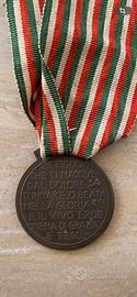 Soggetto: La medaglia raffigura un soldato caduto nudo che riceve una corona d'alloro da una figura femminile alata (la Gloria) e una seconda figura femminile (la madre) ai suoi piedi.