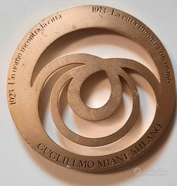 Medaglia Rara Guglielmo Miani-Scultore Carmelo Cappello (1973).Commemorativa 50 anni Guglielmo Miani (Larusmiani)Milano. bronzo dorato 81 mm circa.opera astratta a cerchi intrecciati,tipica dello stile spazialità di Cappello.no perditempo .solo x collezionisti
