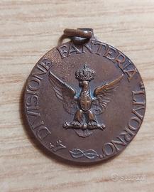 Vendo rarissima medaglia italiana della Seconda Guerra Mondiale della 4 divisione fanteria Livorno che aveva sede a Cuneo. Da una parte si vede una panoramica della città di Cuneo, come appare anche su altre medaglie, ma la parte interessante è l'altro lato che differisce dalle altre medaglie e riporta specificamente 4 divisione fanteria Livorno con l'aquila sabauda.