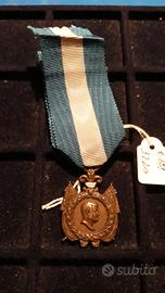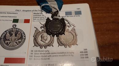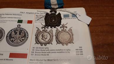 Medaglia, molto rara, in conservazione splendida, in bronzo, del Regno delle Due Sicilie emessa dal Re Ferdinando II per premiare i militari che avevano partecipato alla Campagna d'armi in Sicilia nel 1849. Al dritto entro corona d'alloro, ai lati due bandiere incrociate, in alto giglio borbonico , testa a dx, sul taglio del collo le sigle dell'incisore (L.A. Luigi Arnaud), Al rovescio identico al dritto la scritta su tre righe CAMPAGNA DI SICILIA 1849 Dimensioni 27 x 40 mm circa. Peso gr. 18 circa. Riferimenti: D'auria 226- Ricciardi distintivi d'onore 16 -Brambilla I pag, 234, Von Heyden 374 - Barac III nr. 99 . Il Barac la valuta frai 350 e i 500 ?. La medaglia è corredata dal suo nastro azzurro alternato a bianco conforme all'originale. Metodi di Pagamento: Bonifico Bancario. Vaglia Postale, Paypal, altri sistemi postali, contrassegno (13 euro). Diritto di recesso 10 giorni. Su richiesta dichiarazione di autenticità. Ship Worlwide.