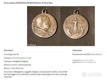 Medaglia religiosa coniata per il Giubileo del 1933-34 in alluminio Maggiori dettagli si trovano nella 2° foto, che riporta la scheda di un'identica medaglia presa dal sito dei Beni Culturali della Lombardia