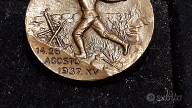 Splendida medaglia originale in bronzo commemorativa della "conquista di Santander" da parte della 524° Bandera "Carroccio", composta da camicie nere volontarie provenienti da MIlano e dalla Lombardia. La Bandera faceva parte del Raggruppamento Banderas "IX Maggio" che aveva preso il nome dalla data di proclamazione dell'Impero italiano (9 maggio 1936). Il Raggruppamento, al comando del Tenente Colonnello Manildo, era stato costituito il 1° giugno 1937 con due banderas CC.NN. (Carroccio e Lupi) ed una bandera di falangisti, formando così un reggimento su tre battaglioni. Partecipò, motorizzato, alla campagna del Nord nelle operazioni contro Santander, in appoggio alla Divisione "Flechas" assieme ad un battaglione mitraglieri e una compagnia lanciafiamme. Il 20 settembre 1937 il Gruppo assunse la denominazione di Reggimento Fanteria Legionaria "IX Maggio" e il 25 dello stesso mese venne sciolto. La 524° Bandera "Carroccio", con le alree due, andò a formare il 3° Reggimento Fanteria della Divisione "Volontari del Littorio". La medaglia non è firmata ed e' stata coniata da Lorioli - Milano nella versione bronzo ( come questa ),bronzo argentato e bronzo dorato. Il nastro non era previsto per nessuna di esse anche se spesso era fornita del nastro delle medaglie commemorative rosso-giallo-rosso come in questo caso. Sul fronte è rappresentato un ardito intento a lanciare una granata oltre una trincea con sotto le date della campagna "14 25 AGOSTO 1937 XV". Sul retro lo stemma della Bandera con il motto "NON MIEIRIS IN BELLO IBIS REDIBIS" (Non morirai in guerra. Andrai e tornerai).Il pagamento per l'acquisto dell'oggetto, potrà essere effettuato a scelta del compratore tramite i seguenti sistemi: bonifico bancario, vaglia postale, ricarica delle poste, paypal (con aggiunta delle commissioni pari al 4%).Diritto di recesso entro 10 giorni. Venduto con expertise.