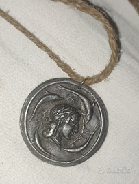 Bellissima medaglia in stile antica moneta Magna Grecia, la proverbiale rarissima Demareteion, ci si può realizzare un pendente da collana o bracciale senza rovinare una moneta autentica, portachiavi, fibbia come in foto, ciondolo per rievocazione storica
