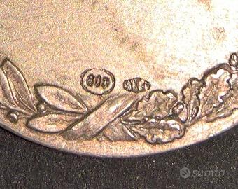 Interessante medaglia d’epoca "post-bellica" ovvero REPUBBLICA ITALIANA coniata fra gli anni '50 e gli anni '60 per i giovani "cadetti" dell'Accademia, futuri ufficiali e piloti dell'Aeronautica Militare Italiana, l’Arma del Cielo. La decorazione è stata realizzata interamente in Argento “800”. Sul dritto reca raffigurato lo spadino dei cadetti dell’accademia Aeronautica con un'aquila ad ali aperte su un bellissimo sfondo fatto da una scia di aeroplani e la scritta “ACCADEMIA AERONAUTICA”. Sul verso è raffigurata una corona, fatta con rami per metà di quercia e l'altra di alloro e al centro il cosiddetto campo targa, dove veniva generalmente inciso a cura del cadetto, il nome con il grado rivestito. Infine, in basso sono presenti i doppi punzoni “800” e “ATA”. La stessa si presenta in "ECCELLENTI" condizioni di conservazione, senza né difetto, né mancanza, e/o rottura alcuna. Misure: diametro = 26 mm. Peso = 8,50 grammi.
