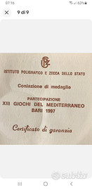 MEDAGLIA ISTITUTO POLIGRAFICO ZECCA DELLO STATO GIOCHI DEL MEDITERRANEO BARI 1997. CON CERTIFICATO ALLEGATO conservazione come da foto