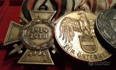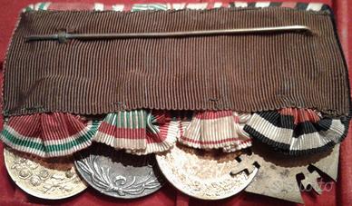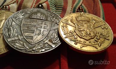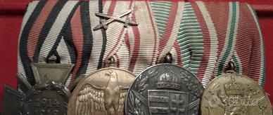 Splendido medagliere della Prima Guerra Mondiale (WW1) di un militare appartenente ai cc.dd. Imperi Centrali ed ai suoi alleati (Prussia-Germania, Impero Austroungarico – KUK, Regno di Bulgaria. Il medagliere è composto da quattro medaglie, tutte con nastrino detto alla prussiana, da sx a dx, abbiamo la Croce di Hindenburg ovvero la medaglia della Germania nazista concessa ai superstiti della WW1 che avessero militato nell'esercito tedesco. Nel luglio 1934, su creata su idea del presidente Hindenburg. Essa venne concessa ai veterani di guerra ed ai superstiti della WW1. La 2a medaglia detta Kreigserinnerungsmedaille" (Medaglia commemorativa della WW1) con spade sul nastro. Istituita il 21.12.32 e destinata a coloro che avevano combattuto nella WW1. Il 10.11.33 vennero aggiunte con apposito decreto le spade in oro sul nastro riservate a coloro che avevano servito al fronte sotto il fuoco nemico, erano rimasti feriti o fatti prigionieri con onore. Sul dritto vi è un’aquila con le ali abbassate sopra lo stemma austriaco postbellico. Sul bordo inferiore la scritta " Fur Osterreich" (Per l'Austria). Sul retro una corona di foglie di quercia circonda le date 1914 e 1918. La 3a è la medaglia ungherese assegnata per meriti ai militari che presero parte alla WW1, istituita il 26.5.29 dal Reggente Ammiraglio Horthy della neonata repubblica ungherese, destinata a tutti i combattenti vestita del suo nastro d'epoca con i colori della nascente Ungheria, la decorazione reca sul fronte "lo scudo ungherese" con spade incrociate e sul retro l'elmetto tipo tedesco "M17", la scritta "PRO DEO ET PATRIA" e la data "1914-1918". La 4a è istituita dal Regno di Bulgaria per coloro che hanno partecipato alla WW1 con gli Imperi centrali. La decorazione è stata realizzata in bronzo dorato e ha sul davanti lo stemma del Regno di Bulgaria con al rovescio le date 1915-1918 in una corona aperta di quercia e rami di alloro. Raro insieme. Bonifico bancario paypal verso amici, altri sistemi postali.