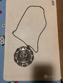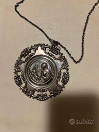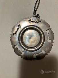 Medaglione capoculla in argento 800, probabilmente prodotto dall'argentiere fiorentino Brandimarte negli anni '50. Pesa gr. 45. finemente lavorato a sbalzo e raffigura madre che veglia il suo bambino.
