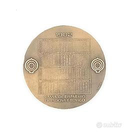 Grossa medaglia in lega di bronzo commissionata come gadget dalla Cassa di risparmio di Padova e Rovigo nel 1982. In evidenza incisione di Roberto Cremesini intitolata "Dopo l'evento" e dall'altra faccia calendario dell'anno in corso. Diametro di circa 7 cm spessore circa 6 mm Peso 165 gr. In condizioni ottime. Spedizione accurata.