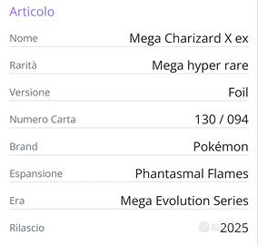 rarità: Mega hype Rare versione: Foil numero carta: 130/094 brand: Pokemon espansione: phantasmal flames era: Mega evolution series rilascio 2025 --------------------------------- No scambio ritiro a mano o spedizione