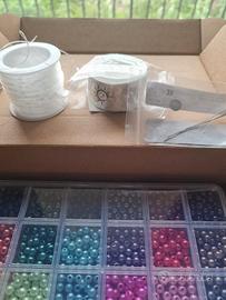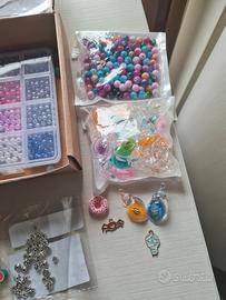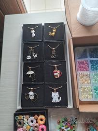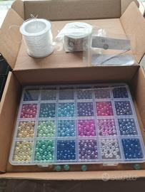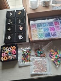 set per la creazione di bracciali e bijoux. Il kit include una scatola organizzatrice con perline colorate di ogni sfumatura, oltre a numerosi sacchetti extra con temi unici: perline a forma di frutta, mini donuts, lettere per comporre nomi, occhietti portafortuna e cuori. Inclusi anche rotoli di filo elastico, charm metallici e 10 collane dorate già pronte con ciondoli a tema gatto (gatto nero, gatto scheletro, gatto in tazza, ecc.). In piú mini covette per poggiare collane e charm inclusa
