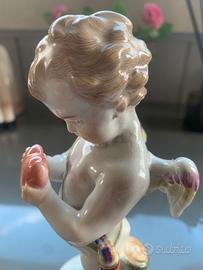 Realizzata con una squisita attenzione ai dettagli, la figura presenta tratti del viso delicatamente dipinti - tra cui guance morbide e arrossate, sopracciglia definite e labbra rosse - che conferiscono alla composizione calore e una sottile animazione. Le ali finemente piumate di Cupido sono accentuate nei toni della lavanda e del bianco, a complemento della faretra modellata che pende sul suo torso, sospesa da una cinghia color lavanda chiaro.