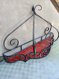 Mensola in ferro battuto con ripiano in vetro dipinto rosso.