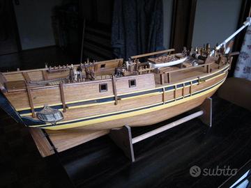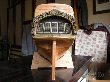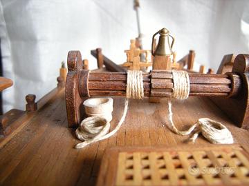il modello sarebbe da ultimare nella parte superiore con scalette e sartiame , l' alberatura con coffe risulta finita compresi i pennoni da applicare agli alberi da fissare allo scafo a parte il bompresso già incollato; anche gli accessori sul ponte sono ultimati.
