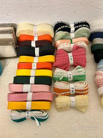 Lotto di merceria varia, comprende elastico, nastri di vari colori, fantasie e tessuti e rocchetti di filo