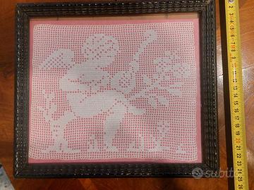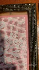 Merletto a filet fatto a mano negli anni Settanta. In cornice e vetro. Ottime condizioni. Raffigura un classico angioletto suonatore.