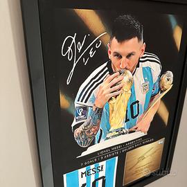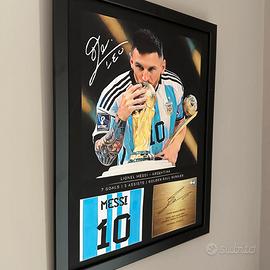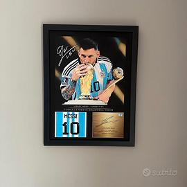 Lionel Messi Celebratory World Cup 2022 - Immagine incorniciata con autografo/firma riprodotta digitalmente. Regalo ideale per gli appassionati di calcio. Immagine di Argentina GOAT Forward presente in cornice 40 cm x 30cm. Può essere appeso o appoggiato. Stampa artistica su tela per con cornice nera per gli appassionati di calcio. Dimensioni: 30x40x1 cm