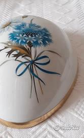 Metà uovo in porcellana. Anni 60. Coperchio in origine di un cofanetto. Decoro floreale e bordo in oro zecchino. In ottime condizioni