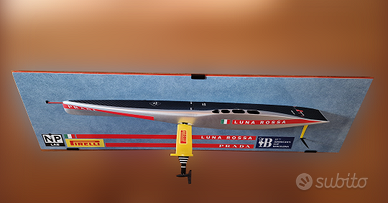 Mezzo scafo Luna Rossa AC75 Prada Pirelli 2024 America' s Cup 37th su mattonella azzurra con bordo rosso.
