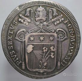 - Mezzo scudo 1796 Pio VI, anno XXII, periziato autentico, in conservazione MB-BB, molto rara (RR), in argento, prezzo 145 euro;