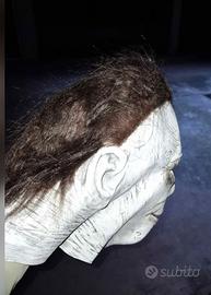 Vendo costume di Michael Myers per adulti, nuovo MAI indossato (senza cartellini) con maschera, tuta da meccanico blu e giocattolo in plastica flessibile.