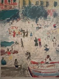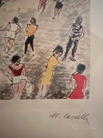 Vendo litografia di Michele Cascella, raffigurante una vivace scena di piazza italiana con folla e architetture colorate, tipico soggetto dell’artista.