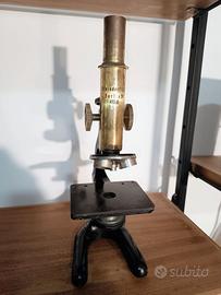 Microscopio Steindorff & C Berlin SW N . 41396, base in ghisa, corpo in ottone, manca vetrino superiore, altezza 32 cm, lunghezza 12 cm, profondità 18 cm, peso 2,5 kg.