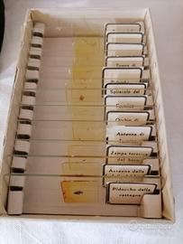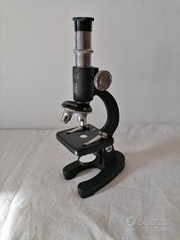 Microscopio ottico Vintage marca MILO. Ingrandimenti: il dispositivo offre diverse opzioni di ingrandimento, nello specifico 100x, 200x, 300x e 600x. Caratteristiche: è dotato di uno stativo metallico, un revolver per gli obbiettivi e specchio per la riflessione della luce. A dotazione: confezione di un set di 12 vetrini con campioni biologici di organi di insetti pronti per essere osservati. Destinato a uso didattico o hobbistico.