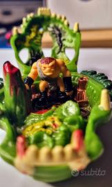 In vendita lo storico playset tascabile Mighty Max "Tames the Tex-Tra" (Mighty Max contro il Dinosauro Tranciatore), un pezzo iconico della cultura pop anni '90 prodotto dalla Bluebird Toys. Stato del Playset: Guscio: Il guscio a forma di testa di dinosauro verde è eccellente. Le plastiche sono lucide, i denti bianchi sono integri e la cerniera è perfettamente funzionante. Interni: Tutti i dettagli scolpiti, inclusi i meccanismi color bronzo e i fossili, mantengono la vernice originale. Marchio: Sul retro è presente l'incisione originale "© '92 Bluebird Toys - Patent Pending" che ne garantisce l'autenticità. Personaggi Inclusi: Mighty Max (Eroe): Versione originale specifica per questo set con canotta beige/gialla e bracciali neri. Tex-Tra (Nemico): Dinosauro stegosauro mutante arancione con cresta blu, in condizioni perfette. Note sulla completezza: Il set include le due figure principali previste per questa ambientazione. L'unica mancanza per la completezza totale è la piccola navicella gialla "Cyber-Saur". Non è inclusa la versione di Max con i jeans, in quanto questo set specifico prevedeva originariamente la versione a tema preistorico inclusa qui.