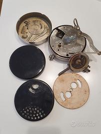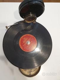 È un gadget adorabile, predecessore del Walkman e dell'iPod. Tutti i pezzi sono all'interno del contenitore di metallo con un diametro di soli 11,5 cm e uno spessore di 4,7 cm. Si assemblano i vari componenti e l'amplificazione avviene tramite la cassa acustica in bachelite in due parti collegata sul braccio pieghevole, si posiziona il disco a 78 giri sul perno del giradischi, si carica la molla e si ascolta. Oggetto funzionante, manca solo la puntina che si trova facilmente su internet. Regalo anche alcuni dischi a 78 giri.